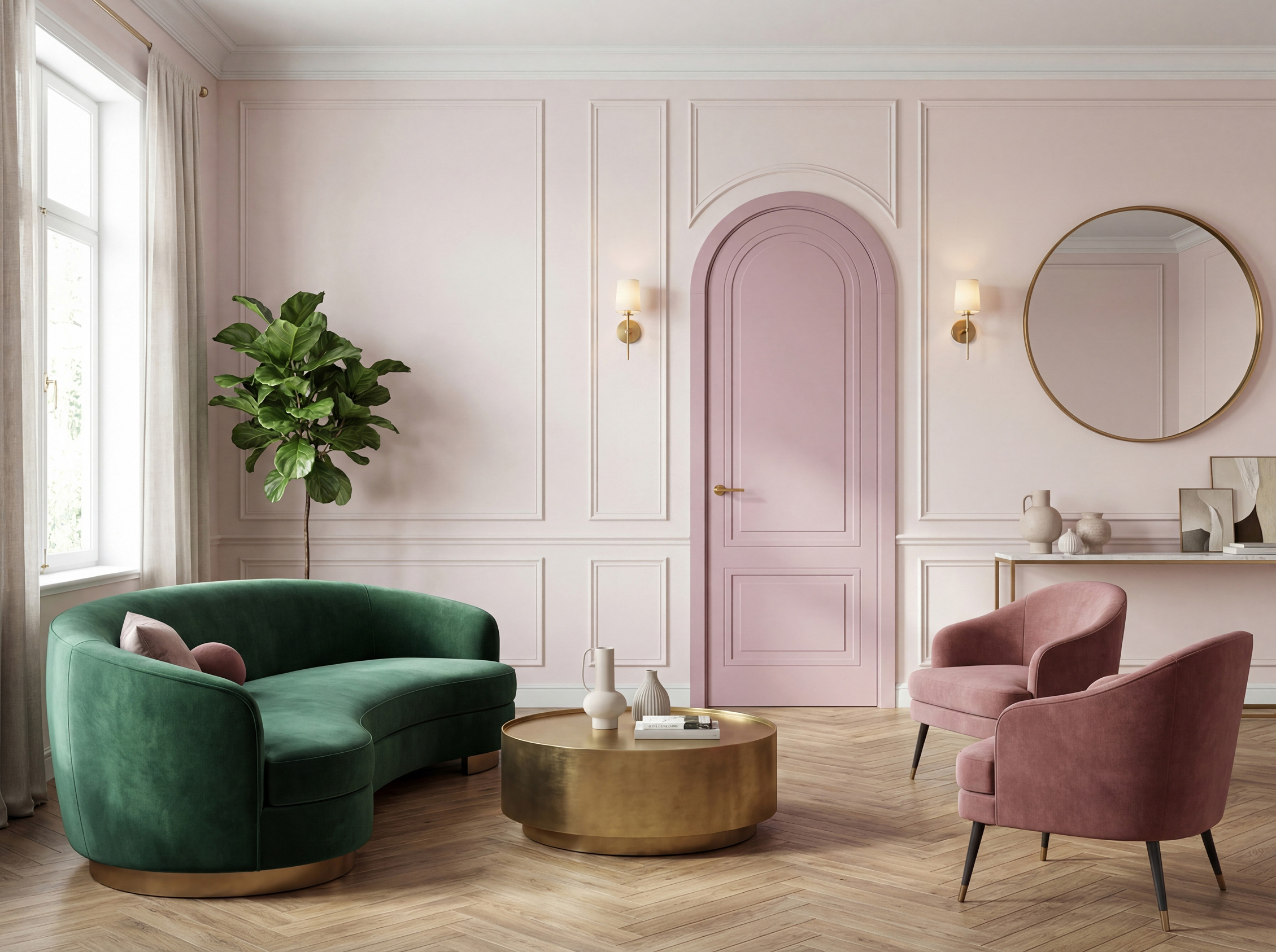 Арка подчёркивает центральность пространства и делает переход между зонами мягче и благороднее.